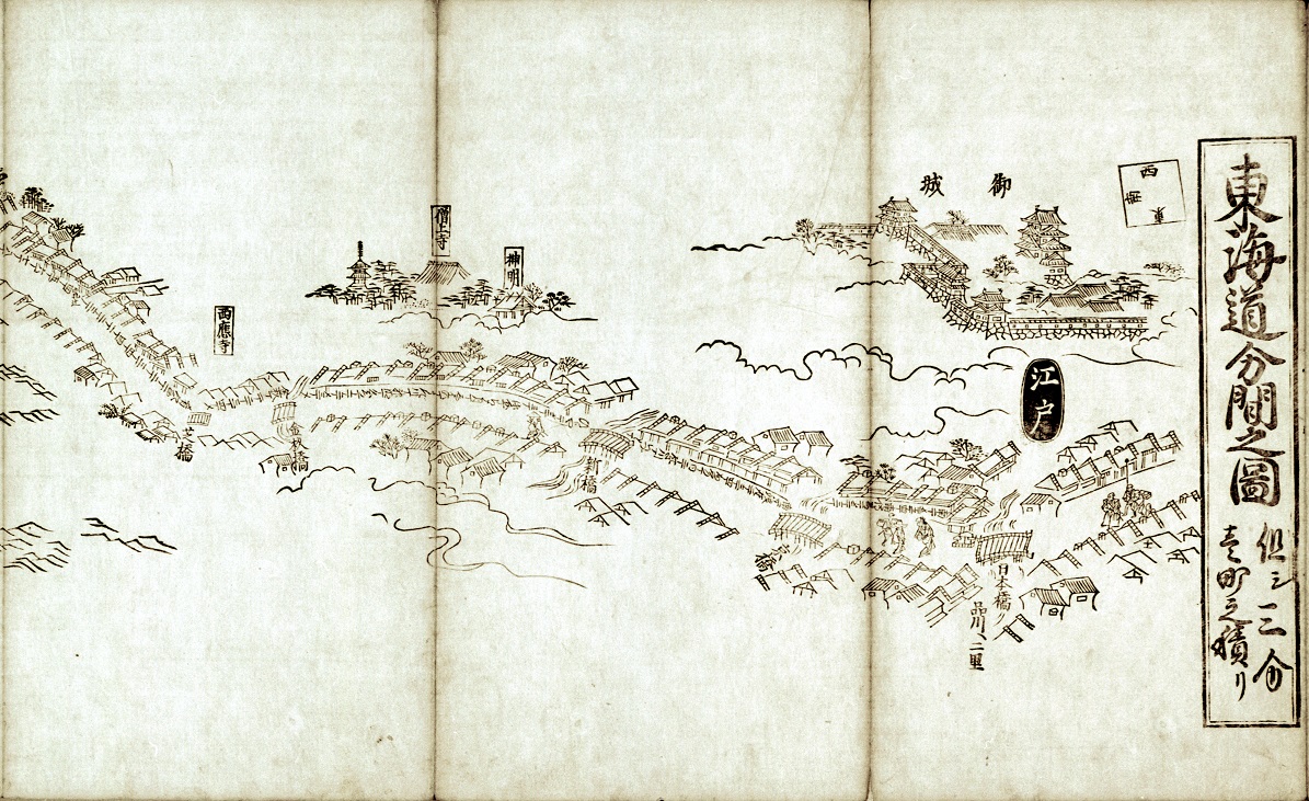 絵図製作者として活躍していた遠近道印が(1620‐?)が作成した原図を基にして、絵師の菱川師宣が街道の風景を描いて、完成させた分間図です。分間(ぶんけん)とは測量するという意味で、測量に基づいて、縮尺して描かれています。