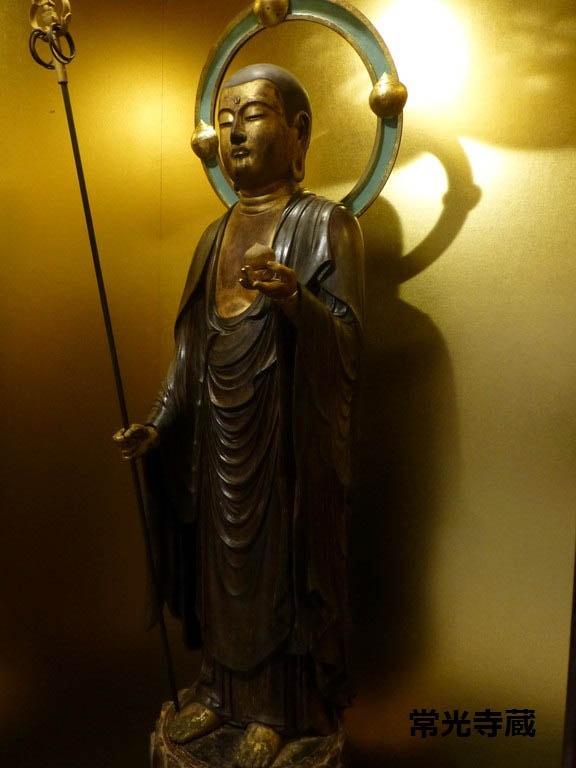 平成28年(2016)2月1日指定/割矧造り、玉眼(水晶の眼)、仏身漆箔、仏衣彩色。 両手、持ち物・光背などは欠失していたのを平成28年(2016)に解体修理した際に補いました。像高91.5㎝ 頭長17.6㎝ 臂張22.8㎝ 腹厚15.6㎝、桧材に彩色。市内現存の地蔵菩薩として最古のもので、技巧的にも優れた優品です。衣文の条数が多いなど、鎌倉を中心に流行した宋風の特徴があります。胸部で仏身と着衣の境を割り矧ぐ、鎌倉仏師の伝統的技法を持ちます。所有管理者:常光寺 |