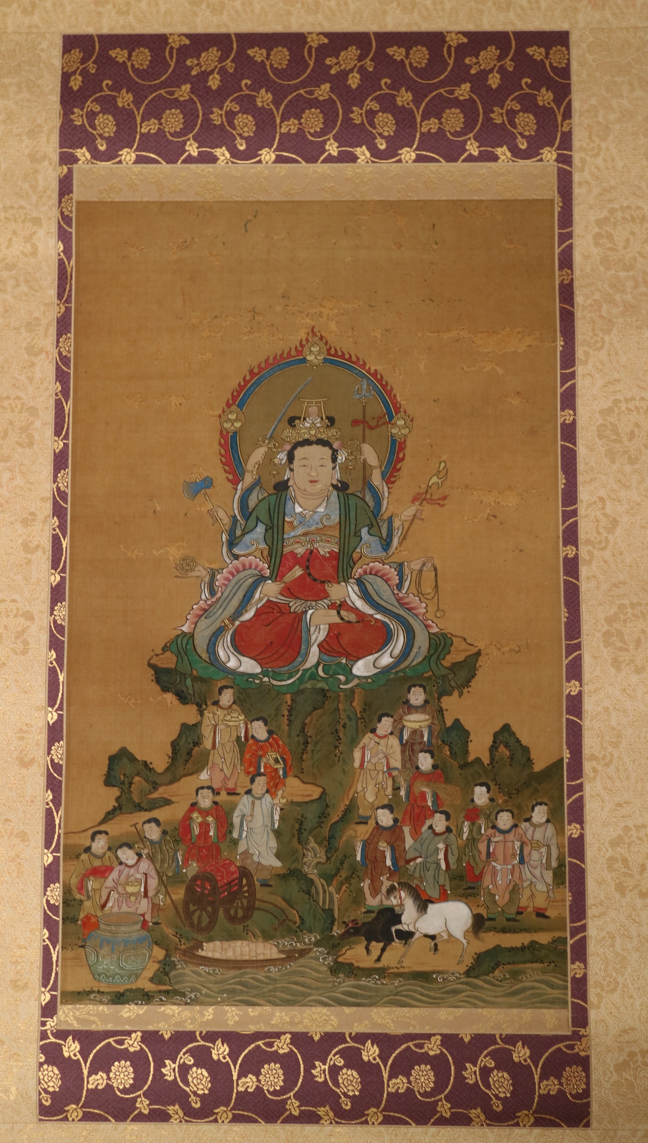 En esta imagen, la diosa Benzaiten tiene 8 brazos y en su cabeza coloca la puerta de entrada al santuario Torii y la deidad Ugajin (antigua deidad japonesa de cosecha y fertilidad) representada con el cuerpo de una serpiente. Esta Benzaiten sincretizada con la deidad Ugajin acentuando su aspecto de diosa de la fortuna es una diosa propia de Japón. El objeto que acompaña no es un instrumento musical Biwa, es un implemento para artes marciales, representando su naturaleza firme como deidad de la guerra. En la parte inferior de la obra se ilustran los 15 asistentes jóvenes que pertenecen a la familia asistente Kenzoku. |