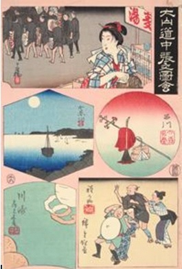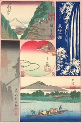 張交図とは、1枚の中に複数箇所の名所(風景、名産、物語等)を並べたもので、広重は東海道をはじめ、各地の張交作品を手がけています。 1枚目は、(上段から)日本橋(夏の名物、麦湯の屋台)、品川(大森〔現大田区〕名物の麦藁細工の纏)、加奈川(神奈川湊の風景)、保土ヶ谷(保土ヶ谷宿の留め女)、川崎(大師河原名物の梨)。 2枚目は、(右下から)戸塚(名物「焼き餅」)、藤沢(宿場の飯盛女)、 四谷追分(四ツ谷の追分。人馬の継ぎ立て場でもあったことを駕籠と馬の足で象徴)、伊勢原(大山麓の街)、大滝(参詣者の水垢離の場であった大山の滝)。 3枚目は、(右下から)田村(四ツ谷から大山へ向かう際の相模川の渡し場)、子安(子安の木地細工)、大山前不動(大山寺の手前にある堂)、石尊寺来迎谷(富士山に日が沈む情景は阿弥陀如来の来迎と例えられていた)、良弁之滝(良弁上人が身を清めたという伝承がある)。 いずれも、大山詣に誘う名所・名物の数々が描かれています。 |