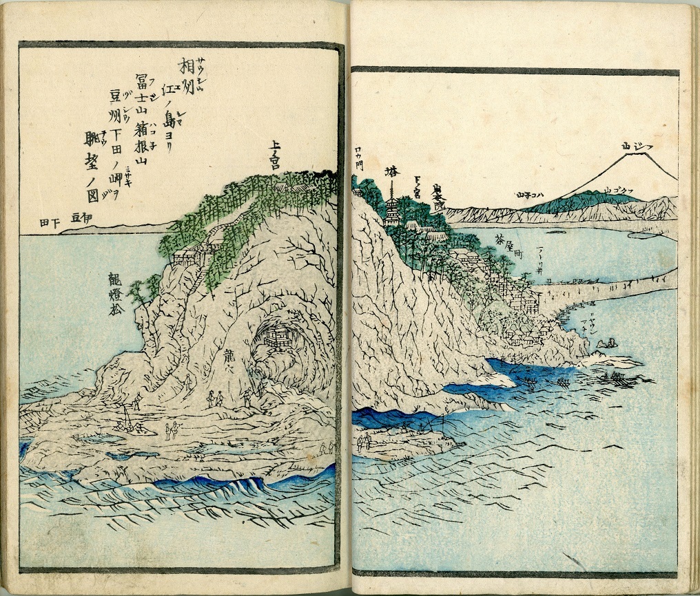 Utagawa Sadahide 1864 The third volume of a series, this book contains a collection of illustrations by Utagawa Sadahide depicting various landscapes, animals, plants, and religious statues from around Japan. The term “shashin” used in the title, translates more closely to “real images,” rather than the contemporary translation of photograph or picture. The title indicates that the artist is depicting subjects as they appear in real life. The collection includes many illustrations of famous locations in Japan. These illustrations are thought to have functioned as guide maps for people on trips, and include labels for particular points of interest for tourists, such as shrines, towns, and scenic locations. The pages on display show the Iwaya side of Enoshima Island with Izu Peninsula, the Hakone mountains, and Mt. Fuji in its backdrop. Various locations within the island are also labeled. Utagawa (Hashimoto) Sadahide 1864 (Genji 1) This illustration book was produced by Utagawa Sadahide, who was known for his exquisite bird’s-eye view landscape drawings. He was called as “Flying Artist”. In volume 3, the paintings of landscapes such as falls, mountains and islands and also statues, such as the statue of Niou are illustrated. |