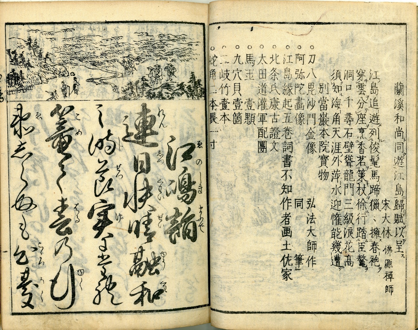 江戸から江の島へ向かう道中の名所・旧跡等について書かれた【往来物】。 往来物とは、平安時代末期から明治前期まで、広く使われた作文の初級教科書のことをいいます。もともと往復の手紙文を例文としたことから往来の名称がつけられました。この書では特に、口絵として「江島金亀山与願寺之図」と、頭書(本文の内容を大まかに示す上欄に書き加えられた文書)に絵や解説文が付けられています 。 |