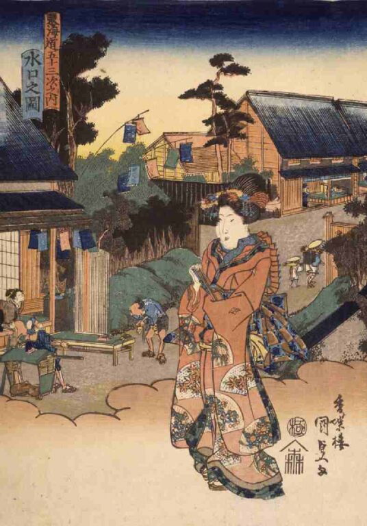 製作時期:天保10年頃(1839)。 板元:佐野喜(佐野屋喜兵衛) 背景は『伊勢参宮名所図会』巻之二より「水口」の図を参考にして描かれています。 画面左の茶屋の前で駕籠ひきが休憩しています。茶屋の屋根の上には、色とりどりの布まねきも見えます。 手前の女性は、頭にびらびら簪を挿し、振り袖姿で描かれ、良家の子女の装いです。 国貞(三代豊国の前名)描くこの東海道シリーズは、各宿の風景をバックにして前面に立ち姿の美人を描いたもので、全シリーズを通し、バックの風景画は広重の保永堂版東海道に非常によく似ています。 |