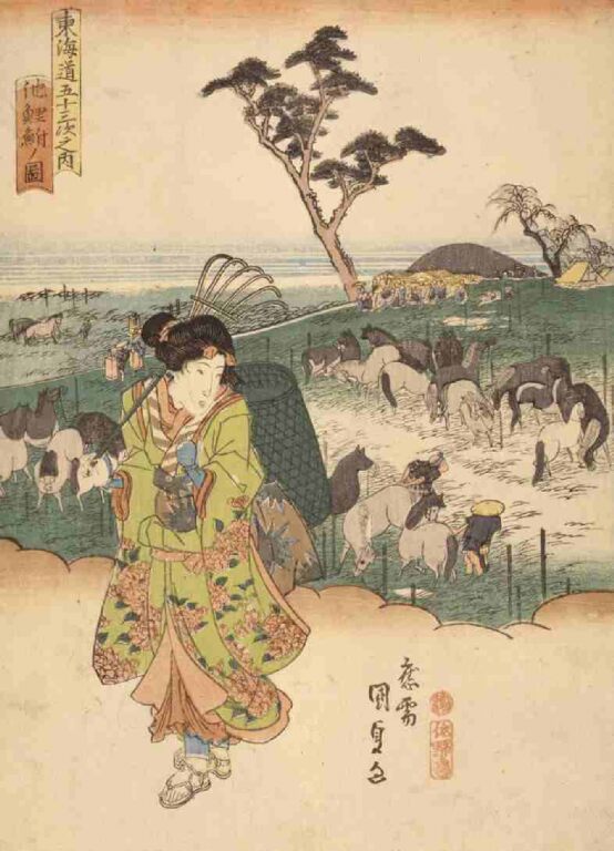 製作時期:天保10年頃(1839)。 板元:佐野喜(佐野屋喜兵衛) 背景は広重の保永堂版東海道「池鯉鮒 首夏馬市」の構図を用いています。 首夏とは陰暦4月のことで、この時期に行われたていた馬市のようすが描かれています。 手前の女性は、竹かごを背負って熊手を持つという秣集めの装いですが、当時このように振り袖姿で作業をしていたわけではなく、美人画に彩りを持たせるための国貞の演出であろうと思われます。 国貞(三代豊国の前名)描くこの東海道シリーズは、各宿の風景をバックにして前面に立ち姿の美人を描いたもので、全シリーズを通し、バックの風景画は広重の保永堂版東海道に非常によく似ています。 |