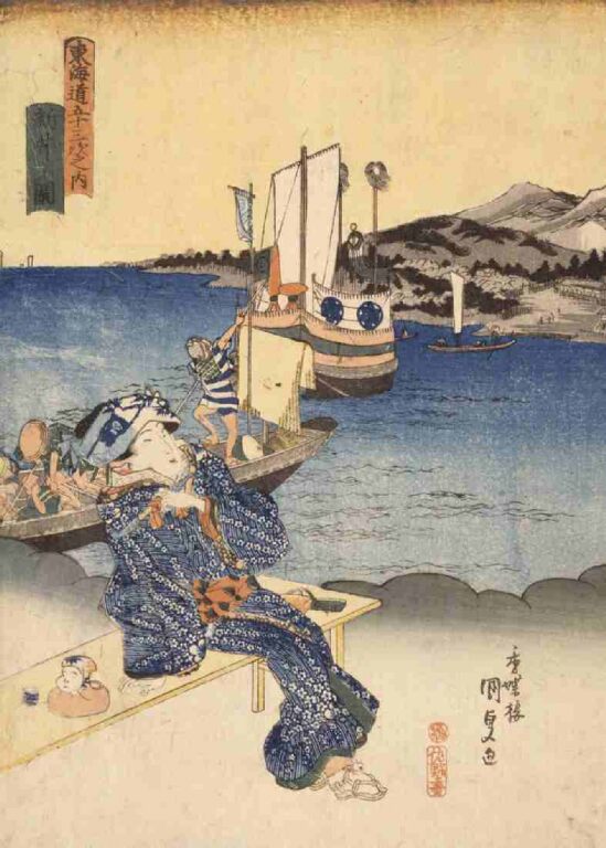 製作時期:天保4年頃(1833)。 板元:佐野喜(佐野屋喜兵衛) 背景は広重の保永堂版東海道「荒井 渡舟ノ図」の構図を用いています。今切の渡しを舟で進み、対岸(西岸)の荒井宿へと向かっている様子が描かれています。後景の右側には新居の関所が見えます。 新居の関所は、箱根の関所と並び取締りの厳しい関所として知られていました。中景には、幔幕を巡らせた大きな船が渡っているのがみえます。 この船は御座船といわれ、大名など貴人を乗せる船のことです。 手前の女性は、旅姿で床几に腰掛けて一服しているところでしょう。そばに置かれたヒョットコの煙草盆が目を引きます。 国貞(三代豊国の前名)描くこの東海道シリーズは、各宿の風景をバックにして前面に立ち姿の美人を描いたもので、全シリーズを通し、バックの風景画は広重の保永堂版東海道に非常によく似ています。 |