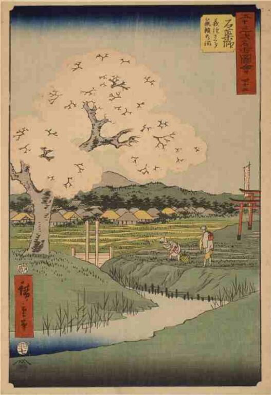 製作時期:安政2年(1855)。 板元:蔦屋吉蔵 源義経の異母弟である範頼は、平氏追討の際に先勝祈願のため桜の枝を逆さに地面にさしたところ、それが芽を出し立派な桜の木になったという伝承があります。 この桜は範頼にゆかりのあるものですが、いつしか「義経桜」とも呼ばれるようになりました。 また、「石薬師の蒲桜」とも呼ばれ、現在でも花を咲かせているようです。 フィンセント・ファン・ゴッホの「タンギー爺さん」の背景には、いくつか浮世絵が模写されていますが、この画はそのうちの一つにあげられています。 このシリーズが竪型版であるため、一般に竪絵東海道と呼ばれ、広重晩年(59才)の作品です。 広重の東海道ものは大体において、横型の風景画が多いなかで、竪型物もいくつかあります。この名所図会シリーズではほとんどの宿が鳥瞰図で描かれ、町並み等に遠近法を用い、横判では見られない雰囲気をかもし出しています。 |