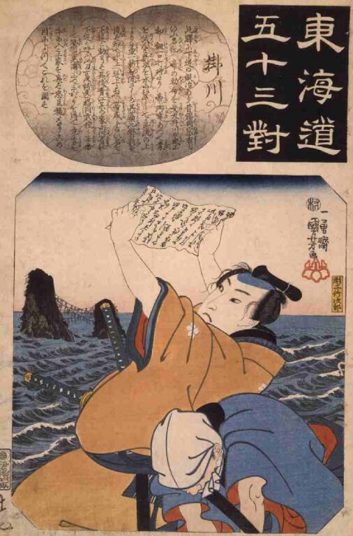 製作時期:天保14年(1843)~弘化4年(1847)。 板元:伊場仙(伊場屋仙三郎) 左上のコマ部分にある詞書によると「主君のために、紛失していた名刀を伊勢の二見浦にて手がかりを得て発見したことに因んでこれを描いた」とあり、図には伊勢の二見浦を背景に朝日の光で手がかりとなった手紙を読む男性(歌舞伎の登場人物)が描かれています。 この名刀「下逆(下坂)」と同じ名前の鍛冶が城下にあるということで本図が選択されたようです。 このシリーズは、初代広重、三代豊国、国芳の3人の当時代表的人気浮世絵師が分担して描いたものです。 風景は少なく人物を主とし、下3分の2が画面で、それぞれの宿にちなんだ伝説、史跡、著名な出来事等を描き、上3分の1に下の絵の説明がなされています。 |