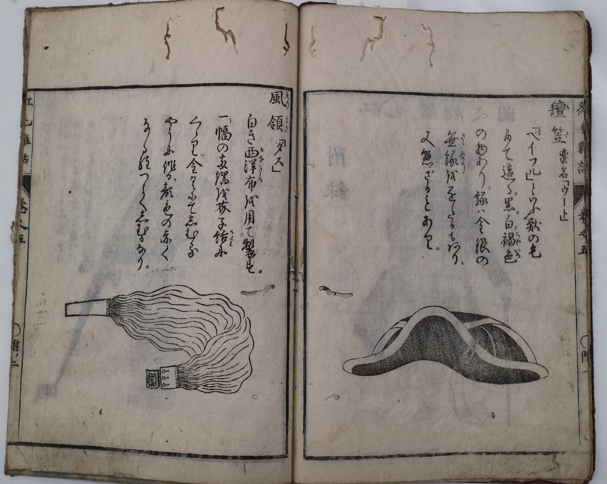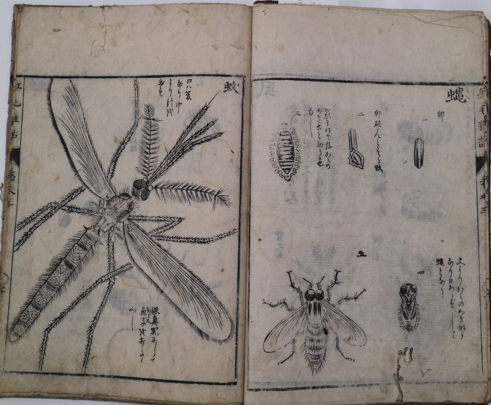 森島中良 作 森島中良・北尾政美・大槻玄沢 画 天明7年(1787) 作者の森島中良は、蘭学者で、戯作者でもあった人です。『紅毛雑話』は、御殿医(江戸時代、将軍や大名に仕えた医師の俗称)であった兄の桂川甫周が、江戸参府のオランダ人から聞いた話などを中良がまとめたもので、天明7年(1787)に刊行されました。蘭学知識を一般向けに解説した啓蒙書です。本図は「ミコラスコービュン」(顕微鏡)の図で、その仕組みや見方の説明がついています。顕微鏡で見た虫を描いた拡大図は有名で、ノミや蚊、ぼうふらなども描かれています。西洋の飛行船やエレキテルといった目新しい事物も紹介されています。 江戸時代の人々が、鎖国政策の中でも、海外の事物に興味を持っていたことが伝わってきます。 |