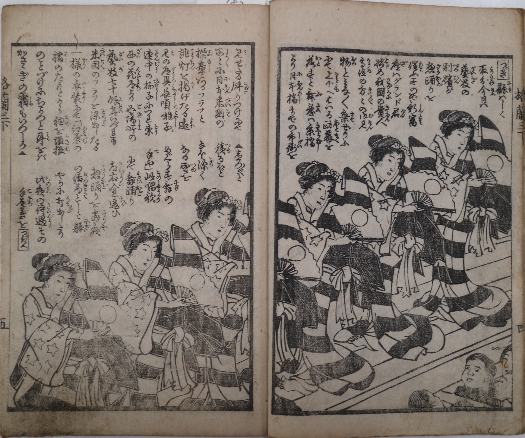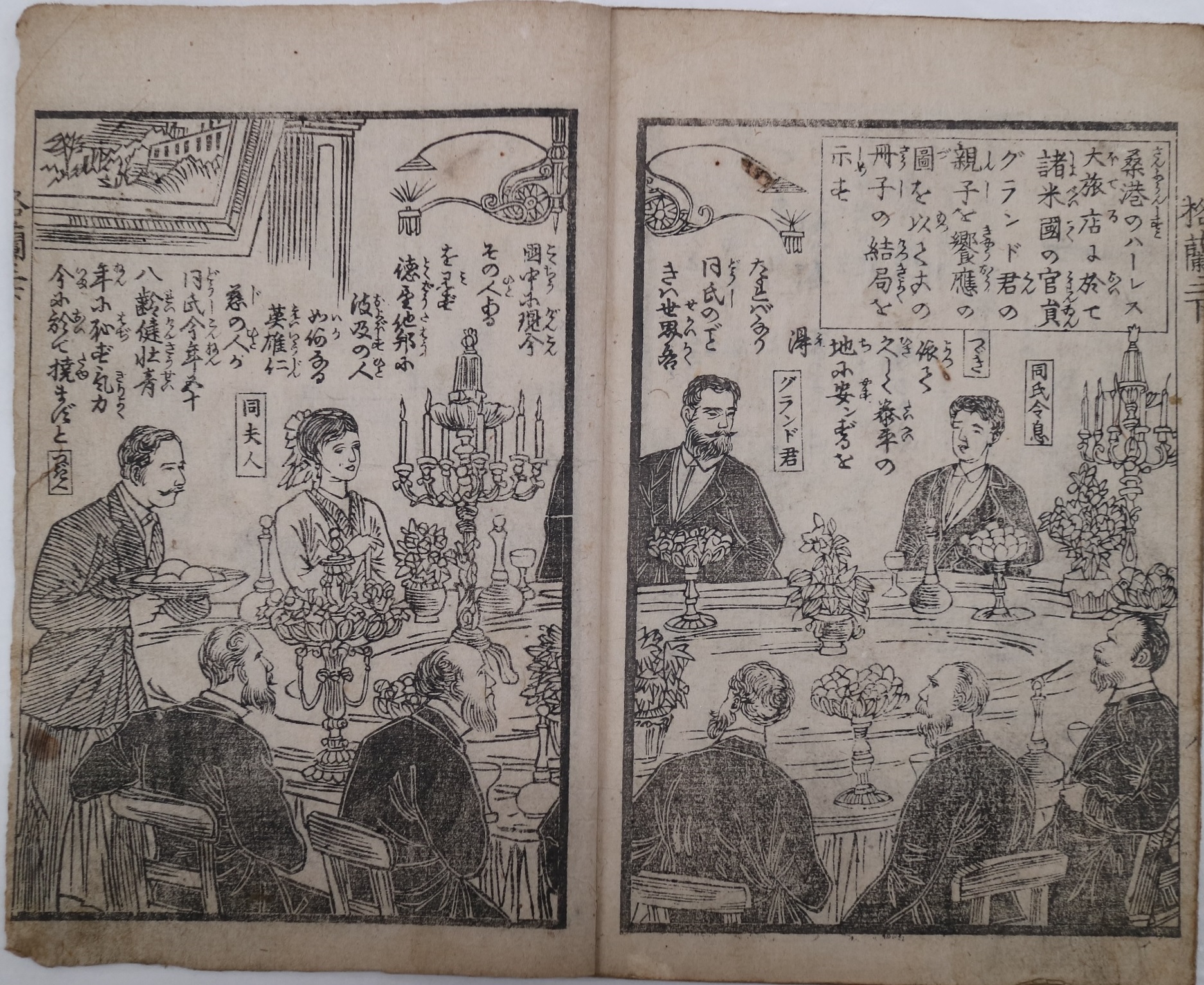 仮名垣魯文 作 歌川国政 画 明治12年(1879) 第18代アメリカ大統領ユリシーズ・S・グラントの幼少から明治12年の日本来訪までが集約されたものです。第三編では、インドや中国を巡り、最終目的地である日本までの旅路とともに、来訪時に開催されたさまざまな行事の様子が紹介されています。 明治には西洋人を題材とした物語が多く出版されました。その内容は、偉人の伝記とともに文化、地理、政治・歴史といった幅広い要素が組み込まれたものでした。「格蘭氏伝倭文賞」もそのひとつで、幕末から明治初期に活躍した戯作者、仮名垣魯文によって書かれました。 |