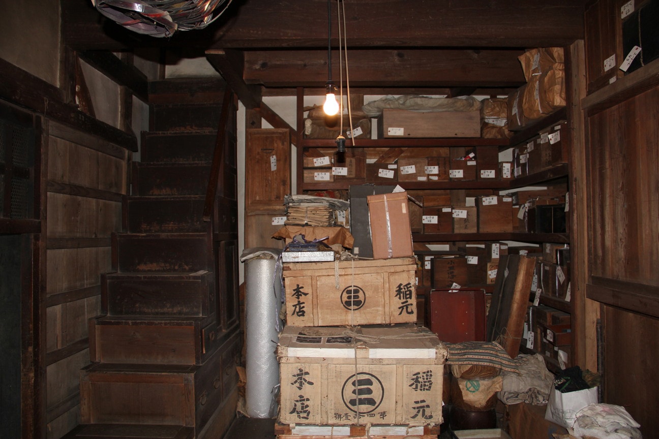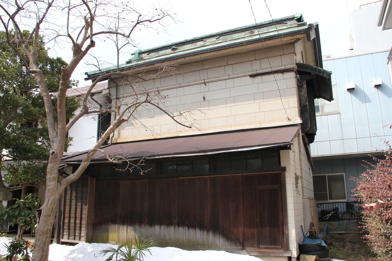 平成27年(2015)8月4日登録/旧稲元屋呉服店は、戦前の藤沢を代表する呉服商です。初代は、藤沢の豪商「豊元屋」の七子で、厚木の雑貨商「内田商店」に奉公した後、弘化2年(1845)に生家の家業である雑貨薪炭商「稲穂屋」を継いで現在地に創業しました。「稲元屋」の屋号は、「稲穂屋」と生家「豊元屋」から1字ずつ取って名付けたものです。創業後間もなく呉服商に転業、さらに婚礼需要を見込んで箪笥部を加え事業を拡大しました。旧稲元屋は、明治24年(1891)10月の関東地方陸軍大演習の際、明治天皇の行在所を務めました。さらに、昭和初期までに皇族らの宿泊所として10度用いられるなど、藤沢でも有数の名家でした。昭和15年(1940)に建立された行在所記念碑も、敷地南側に現存しています。かつては一番庫から八番庫まで蔵がありましたが、昭和52年(1977)の火災、老朽化した蔵の解体で内蔵・一番蔵の2棟のみが現存します。 内蔵は、桁行き三間半×梁間二間の平側に入口を設けます。切妻造銅板葺で、の平側に下屋を設け、板敷きでガラス戸を立てて室内化しています(蔵前)。かつては、板敷きの廊下は店舗・住居へと接続していました。1階の床高は72㎝と高く、「内蔵」との呼称のとおり家財や文書を収める家財蔵として用いられました。壁は、擬石風の洗い出し仕上げで、軒裏と塗り上げのみ白漆喰で仕上げています。入口は蛇腹四段の重厚な造りで、見込み部分と扉面のみ黒漆喰塗で仕上げています。2階北側には、蛇腹三段の窓を設け、扉・窓枠・庇軒裏などすべて黒漆喰仕上げです。屋根、庇ともに銅板葺きで棟装飾など丁寧な造作です。構造・形式:土蔵造、2階建、切妻造、銅板葺、蔵前を付す。建設の年代:昭和10年。所有者:個人。 |