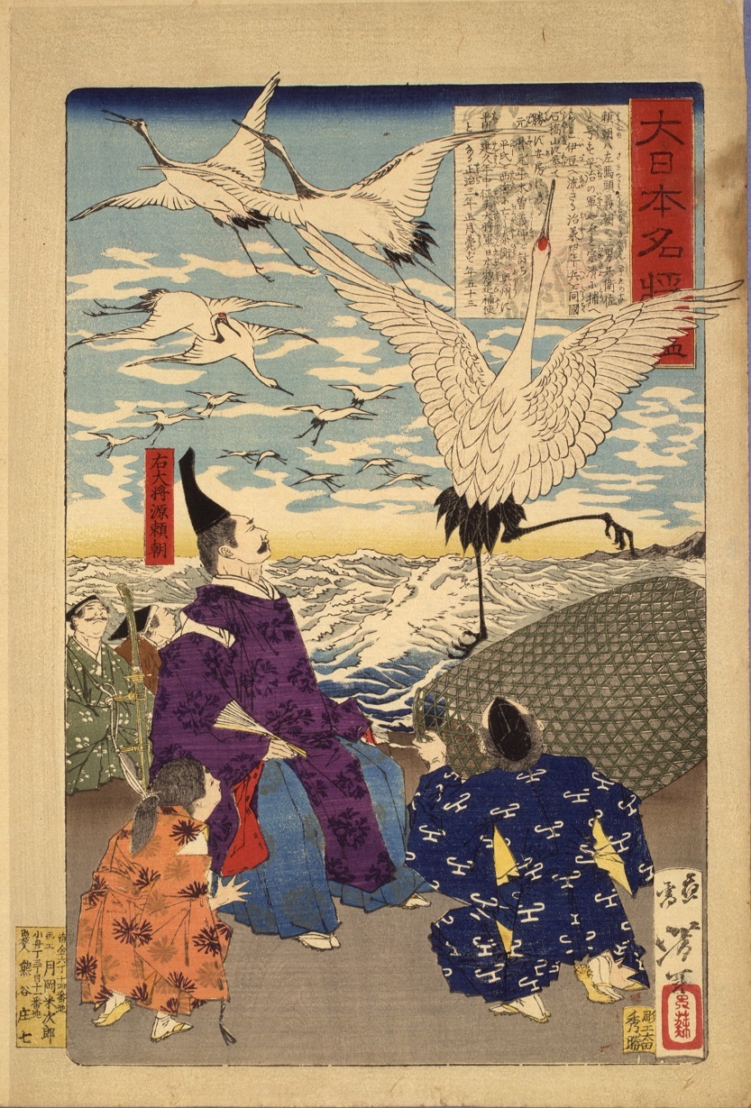 후지산을 올려다보는 사람은 사이교 법사입니다. 헤이안시대 말기부터 가마쿠라시대 초기의 승려이며 가인이기도 합니다. 오슈로 여행을 떠나는 도중에 후지산에 대한 와카(바람에 휘날리는 후지의 연기가 하늘로 사라지니, 정처 없이 흘러가는 내 마음과도 같구나)를 읊은 바 있습니다.
