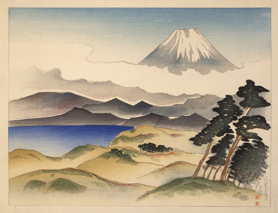 조감도적인 구도에 뛰어난 사다히데에게는 후지산을 그린 작품이 많이 있습니다만, 이것은 후지산을 거의 분화구 바로 위에서 그린 그림입니다. 자세히 보면 분화구에는 또 한 장의 종이가 접혀 있으며, 당기면 입체적으로 일어서는 구조로 되어있습니다. 또 화면 왼쪽의 산기슭 주변에는 또 한 장의 종이가 붙여져 있으며, 그것을 젖히면 동굴이 나타나고 동굴 내부를 순례하는 사람들이 그려져 있습니다. 이것은 후지 등산의 행정 중 하나인 「동굴 내부 순례」를 그린 것으로, 당시의 인기 정도를 엿볼 수 있습니다.