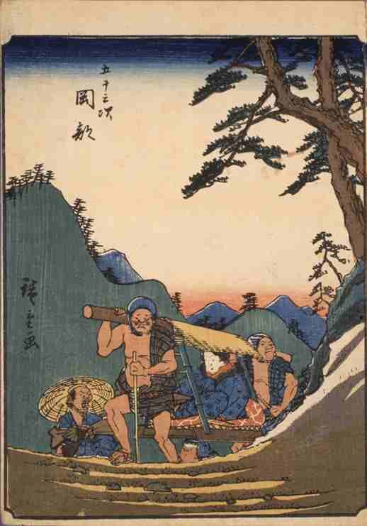 배경에는 역참의 풍경이 그려져 있고, 앞의 인물은 역참과 관련 있는 가부키의 등장인물입니다.