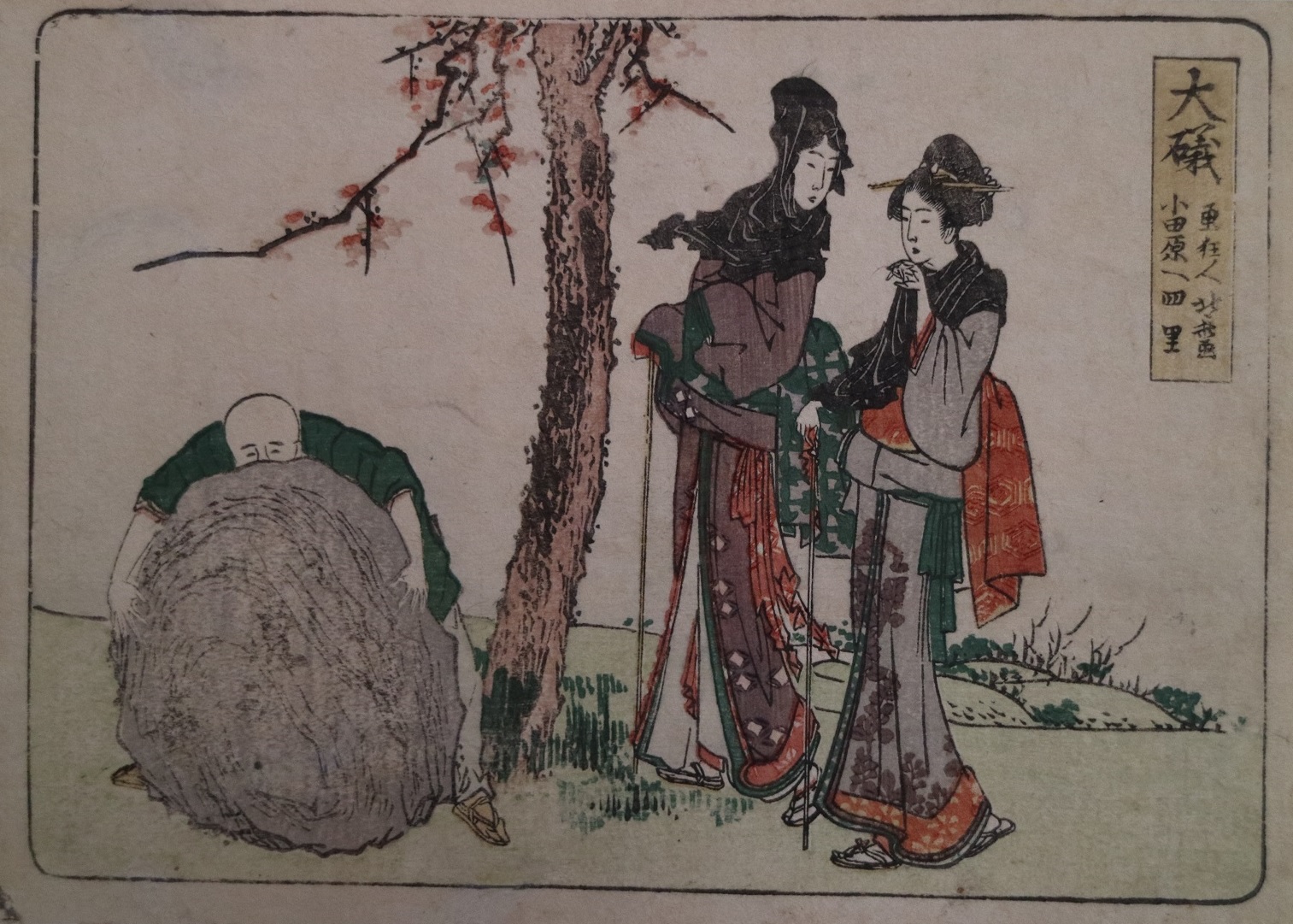 豊原國周/三代歌川廣重 1867 這幅作品是以和當時的人氣歌舞伎演員有關連的宿驛為背景而繪製的系列。所謂的「一眼千兩」,就是為了一睹芳容而不惜一擲千金的意思。畫中的背景是由二代廣重、前景中的人物則是由國周來分擔繪製的。該人物是在以「白波五人男」之稱而聞名的歌舞伎演出劇目「青砥稿花紅彩畫」中的登場人物之一、且與江之島有因緣關係的弁天小僧菊之助。飾演者是第四代市村家橘(之後是第五代尾上菊五郎)。