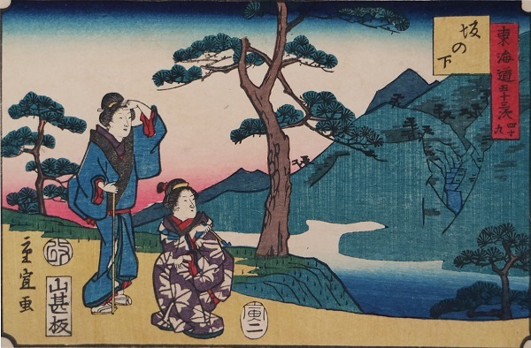 二代歌川廣重 1854 由於自坂之下驛站前往土山驛站之路必經鈴鹿山脊,因此描繪了巍峨聳矗之岩山。此畫作中之兩位女性正享受欣賞鈴鹿山脊之絕美景色。