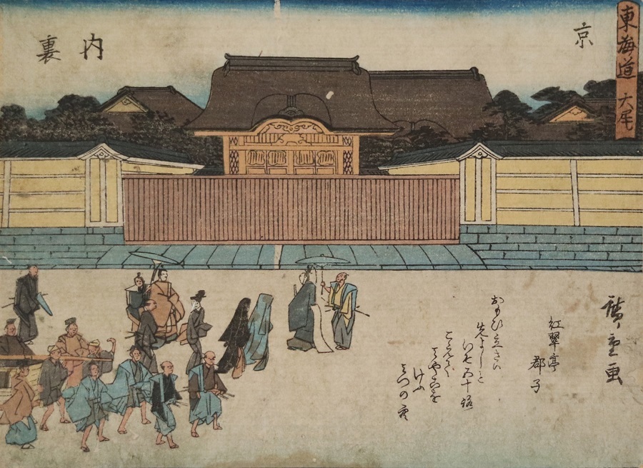 作者:歌川廣重 1840 本系列將京都分別繪於兩個作品上。此作品描繪了內裏(天皇私人區域)南面正門的建禮門。在其前方有身穿裃(正式男和服)的男性為身穿束帶(公卿裝束)的男性撐陽傘之模樣,另有披著絹被衣的貴族女孩等,各種身分的人們穿梭來去。 這個系列因畫面上綴有狂歌(當時流行的滑稽和歌) 而被稱為「狂歌入東海道」。