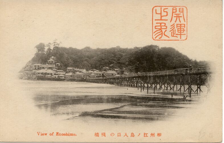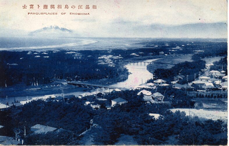標題(ひょうだい)(和文(わぶん)) 相刕(そうしゅう)江(え)の島(しま)相模灘(さがみなだ)ト富士(ふじ) 標題(ひょうだい)(欧文(おうぶん)) FAMOUSPLACES OF ENOSHIMA 商標(しょうひょう) 不明(ふめい) 発行(はっこう)元(もと)・製造元(せいぞうもと) 不明(ふめい) 年代(ねんだい) 不明(ふめい)