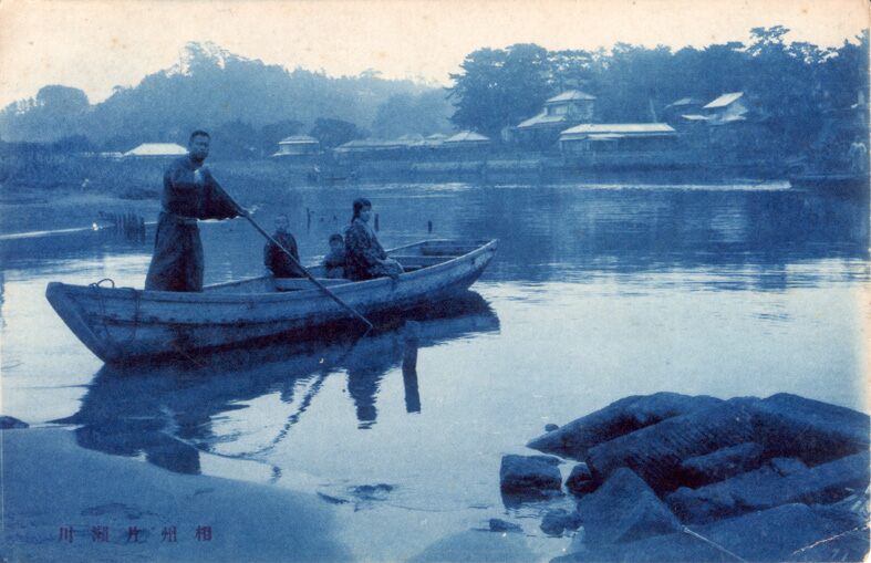 標題(ひょうだい)(和文(わぶん)) 相州(そうしゅう)片瀨川(かたせがわ) 商標(しょうひょう) 日(ひ)の丸(まる)扇子(せんす) 葉(は)の枠(わく) 発行(はっこう)元(もと)・製造元(せいぞうもと) 片瀬(かたせ)写真(しゃしん)館(かん) 年代(ねんだい) 不明(ふめい)