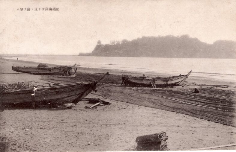 鵠沼海岸(くげぬまかいがん)ヨリ江ノ島(えのしま)ヲ望(のぞ)ム