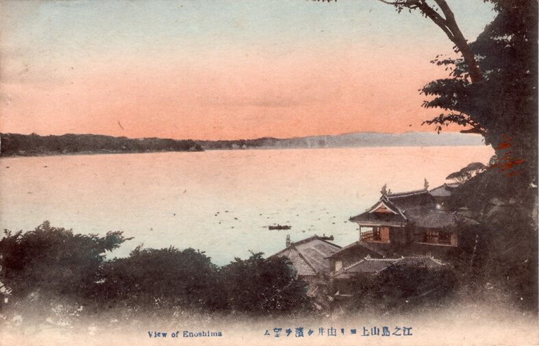 標題(ひょうだい)(和文(わぶん)) 江之島(えのしま)山上(さんちょう)ヨリ由井ヶ濱(ゆいがはま)ヲ望(のぞ)ム 標題(ひょうだい)(欧文(おうぶん)) Vire of Enoshima 商標(しょうひょう) 不明(ふめい) 発行(はっこう)元(もと)・製造元(せいぞうもと) 不明(ふめい)
