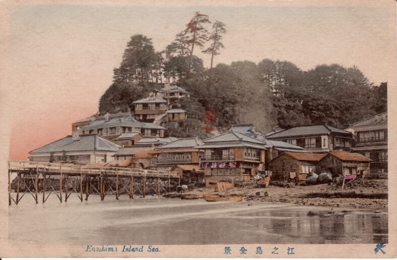 標題(ひょうだい)(和文(わぶん)) 江之島(えのしま)全景(ぜんけい) 標題(ひょうだい)(欧文(おうぶん)) Enoshima Inland Sea. 地域(ちいき) 片瀬(かたせ)・江(え)の島(しま) 商標(しょうひょう) トンボ 発行(はっこう)元(もと)・製造元(せいぞうもと) トンボヤ 年代(ねんだい) 不明(ふめい)