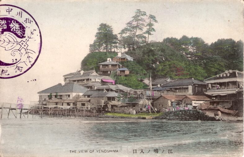 標題(ひょうだい)(和文(わぶん)) 江(え)ノ嶋(しま)ノ入口(いりぐち) 標題(ひょうだい)(欧文(おうぶん)) THE VIEW OF YENOSHIMA 商標(しょうひょう) 不明(ふめい) 発行(はっこう)元(もと)・製造元(せいぞうもと) 不明(ふめい) 年代(ねんだい) 不明(ふめい)