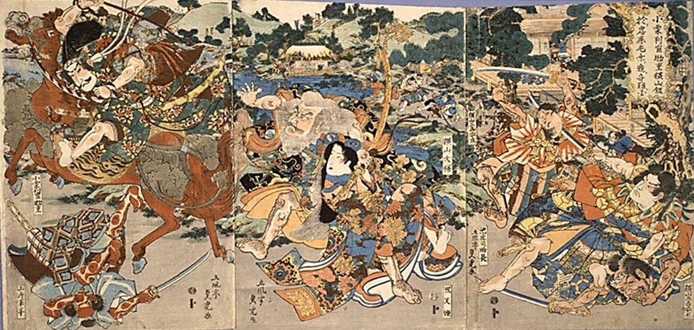 ダイナミックな構図(こうず)が目(め)を引(ひ)く本作(ほんさく)は、照手(てるて)姫(ひめ)の父(ちち)、横山(よこやま)の家(いえ)での一(いち)場面(ばめん)を描(えが)いたものです。画面(がめん)左(ひだり)に荒馬(あらうま)の「鬼(おに)鹿毛(かげ)」を乗(の)りこなす小栗判官(おぐりはんがん)が描(えが)かれ、中央(ちゅうおう)には横山(よこやま)と照手(てるて)姫(ひめ)、右(みぎ)で横山(よこやま)の手下(てした)を組(く)み伏(ふ)せている人物(じんぶつ)は、小栗判官(おぐりはんがん)の家臣(かしん)「池庄司(いけしょうじ)助長(すけなが)」です。小栗(おぐり)達(たち)と横山(よこやま)の者(もの)が戦闘(せんとう)している様子(ようす)ですが、このような場面(ばめん)は説教(せっきょう)節(ぶし)にはなく、武者絵(むしゃえ)としてアレンジされた作品(さくひん)と考(かんが)えられます。