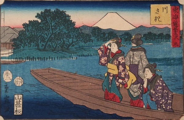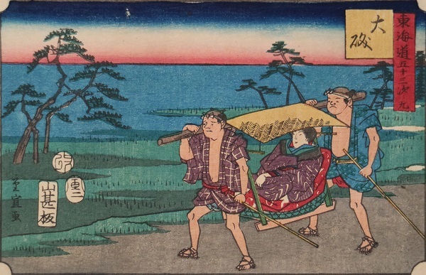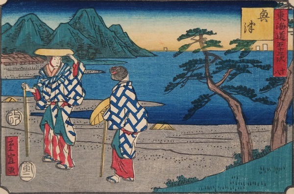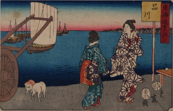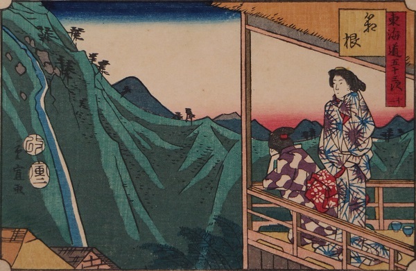 権太坂(ごんたざか)(ごんたざか)は、東海道(とうかいどう)で江戸(えど)を発(た)ってから最初(さいしょ)に出会(であ)う上(のぼ)り坂(ざか)の難所(なんしょ)として知(し)られています。後景(こうけい)には権太坂(ごんたざか)を上(のぼ)る旅人(たびびと)の姿(すがた)が薄暗(うすぐら)く描(えが)かれている一方(いっぽう)、画面(がめん)手前(てまえ)の茶屋(ちゃや)の風景(ふうけい)は色鮮(いろあざ)やかに描(えが)かれているのが対照的(たいしょうてき)です。