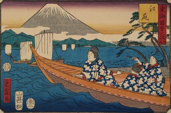 白浪五人男(しらなみごにんおとこ)の背景(はいけい)には江の島(えのしま)と富士山(ふじさん)が見(み)え、稲村ヶ崎(いなむらがさき)より海路(かいろ)遠州灘(えんしゅうなだ)を通(とお)って追(お)っ手(て)から逃(のが)れようとする場面(ばめん)を描(えが)いています。空(そら)の鮮(あざ)やかな赤(あか)や、着物(きもの)の紫(むらさき)といった明治(めいじ)の浮世絵(うきよえ)を象徴(しょうちょう)する色(いろ)が目(め)を引(ひ)く、ダイナミックな作品(さくひん)となっています。