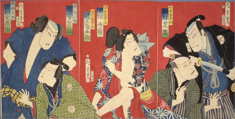 製作(せいさく)時期(じき):天保(てんぽう)14年(ねん)(1843)~弘化(こうか)4年(ねん)(1847)。 板元(はんもと):遠州屋又兵衛(えんしゅうやまたべえ) 島田宿(しまだしゅく)と金谷宿(かなやしゅく)の間(ま)を流(なが)れる大井川(おおいがわ)には、橋(はし)や渡(わた)し舟(ぶね)がなく、人足(にんそく)による徒歩(とほ)渡(わた)しが行(おこな)われているのみであったので、増水(ぞうすい)の際(さい)は川留(かわどめ)めとなり渡(わた)ることができませんでした。そのため、東海道(とうかいどう)の難所(なんしょ)の一(ひと)つに数(かぞ)えられました。 画(が)中(ちゅう)では、大(おお)きな体(からだ)の関取(せきとり)が蓮台(れんだい)に乗(の)り、人足(にんそく)12人(にん)がかりで担(かつ)がれています。この関取(せきとり)は、帯刀(たいとう)し、装飾(そうしょく)の施(ほどこ)された煙管(きせる)を使用(しよう)していることから、藩(はん)お抱(かか)えの力士(りきし)(藩(はん)お抱(かか)えの力士(りきし)になると俸禄(ほうろく)が与(あた)えられる)であると考(かんが)えられます。 このシリーズは、初代(しょだい)広重(ひろしげ)、三代(さんだい)豊国(とよくに)、国芳(くによし)の3人(にん)の当時(とうじ)代表的(だいひょうてき)人気(にんき)浮世絵師(うきよえし)が分担(ぶんたん)して描(えが)いたものです。 風景(ふうけい)は少(すく)なく人物(じんぶつ)を主(おも)とし、下(した)3分(ぶん)の2が画面(がめん)で、それぞれの宿(やど)にちなんだ伝説(でんせつ)、史跡(しせき)、著名(ちょめい)な出来事(できごと)等(など)を描(えが)き、上(うえ)3分(ぶん)の1に下(した)の絵(え)の説明(せつめい)がなされています。