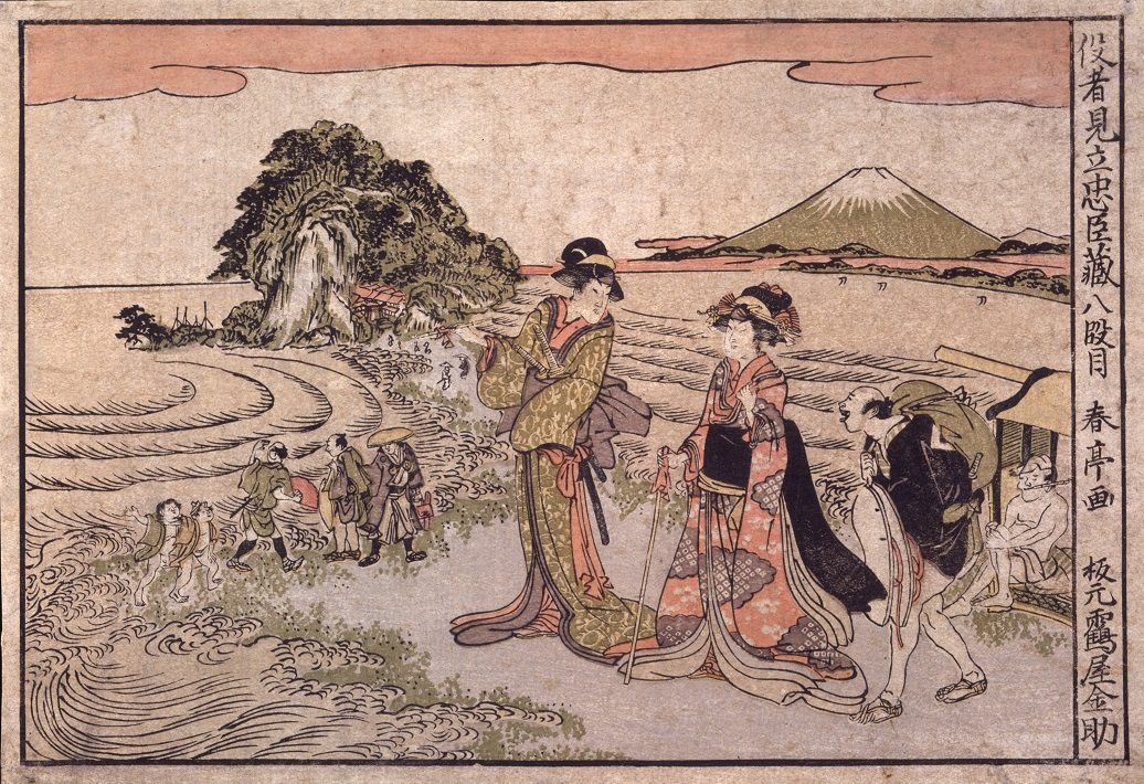 製作(せいさく)時期(じき):天保(てんぽう)14年(ねん)(1843)~弘化(こうか)4年(ねん)(1847)。 板元(はんもと):遠州屋又兵衛(えんしゅうやまたべえ) 田子(たご)の浦(うら)は、古来(こらい)より風光明媚(ふうこうめいび)の地(ち)として知(し)られています。浜辺(はまべ)に立(た)つ男性(だんせい)は、田子(たご)の浦(うら)の風景(ふうけい)を歌(うた)に詠(よ)んで有名(ゆうめい)な平安時代(へいあんじだい)の歌人(かじん)(小倉百人一首(おぐらひゃくにんいっしゅ)「田子(たご)の浦(うら)に 打(う)ち出(だし)でてみれば 白妙(しろたえ)の 富士(ふじ)の高嶺(たかね)に 雪(ゆき)は降(お)りつつ」を詠(よ)んだ山部(やまべ)赤人(あかひと))を連想(れんそう)させます。 画面(がめん)中央(ちゅうおう)には三保(みほ)の松原(まつばら)が広(ひろ)がり、その奥(おく)には愛鷹山(あしたかやま)と富士山(ふじさん)を配(はい)し、広重(ひろしげ)ならではの空間(くうかん)構成(こうせい)がなされています。 このシリーズは、初代(しょだい)広重(ひろしげ)、三代(さんだい)豊国(とよくに)、国芳(くによし)の3人(さんにん)の当時(とうじ)代表的(だいひょうてき)人気(にんき)浮世絵師(うきよえし)が分担(ぶんたん)して描(えが)いたものです。 風景(ふうけい)は少(すく)なく人物(じんぶつ)を主(おも)とし、下(した)3分(ぶん)の2が画面(がめん)で、それぞれの宿(やど)にちなんだ伝説(でんせつ)、史跡(しせき)、著名(ちょめい)な出来事(できごと)等(など)を描(えが)き、上(うえ)3分(ぶん)の1に下(した)の絵(え)の説明(せつめい)がなされています。