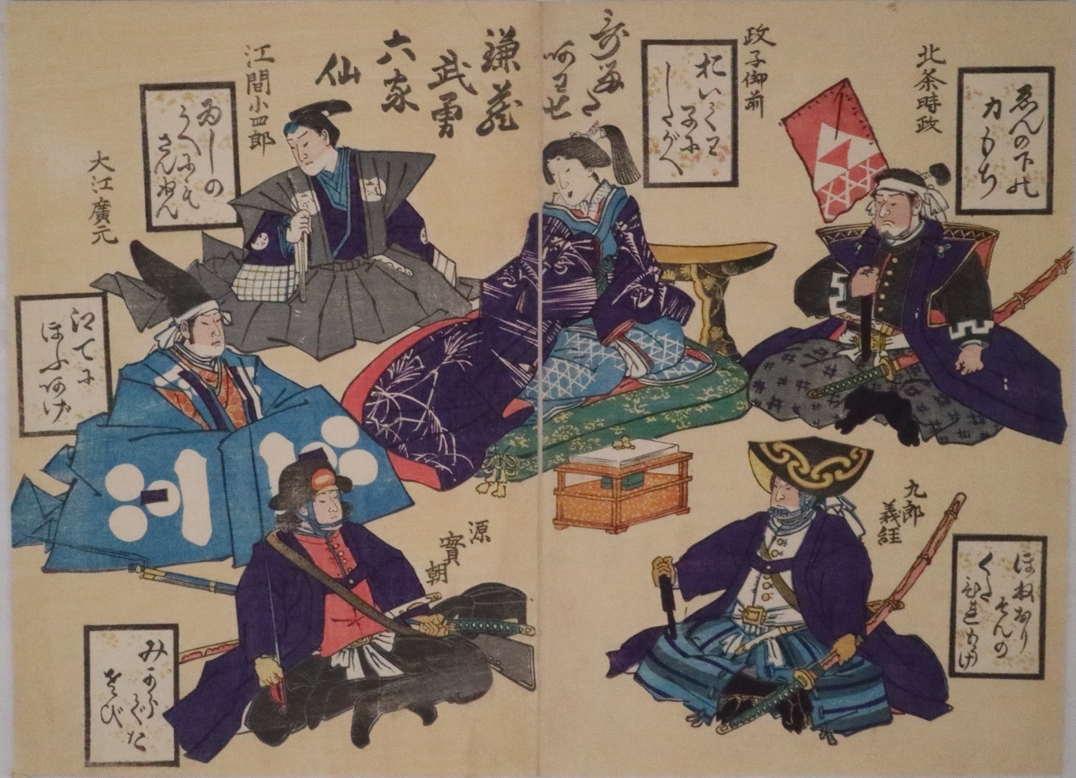 鎌倉時代(かまくらじだい)の武将(ぶしょう)を六歌仙(ろっかせん)に見立(みた)てて風刺(ふうし)した戯画(ぎが)です。各人(かくじん)の隣(となり)にそれぞれ掲(かか)げられた札(ふだ)の文言(もんごん)には、彼(かれ)らの歴史(れきし)的(てき)な状況(じょうきょう)が皮肉(ひにく)を交(まじ)えて書(か)かれています。幕末(ばくまつ)に日本(にっぽん)で起(お)きた革命(かくめい)のさなかにおける諸(しょ)勢力(せいりょく)も暗示(あんじ)されているようです。