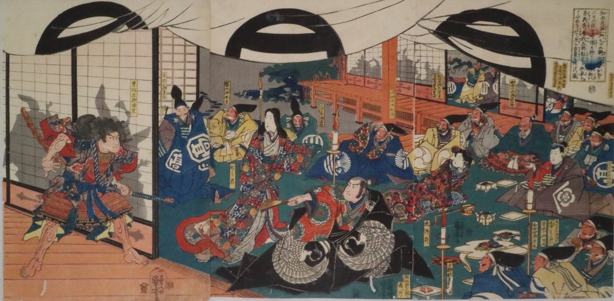 表題(ひょうだい)の宴(うたげ)は、建久(けんきゅう)4年(ねん)(1193)に頼朝(よりとも)が行(おこな)った富士(ふじ)の巻狩(まきが)りにあたっての祝(いわ)いの宴(うたげ)。巻狩(まきが)りを前(まえ)に血気(けっき)にはやる曽我(そが)五郎(ごろう)時宗(ときむね)(左手(ひだりて)、障子(しょうじ)の手前(てまえ))と、右手(みぎて)に座(すわ)る十郎(じゅうろう)祐成(すけなり)とを対照(たいしょう)的(てき)に描(えが)いています。中央(ちゅうおう)手前(てまえ)に座(すわ)るのが、和田義盛(わだよしもり)の子(こ)、小林(こばやし)朝比奈義秀(あさひなよしひで)。義秀(よしひで)の左(ひだり)には、大磯(おおいそ)廓(くるわ)の遊女(ゆうじょ)、化粧坂(けはいざか)の少将(しょうしょう)。右(みぎ)には同(どう)じく遊女(ゆうじょ)で十(じゅう)郎(ろう)祐成(すけなり)の妾(そばめ)、虎御前(とらごぜん)が描(えが)かれています。