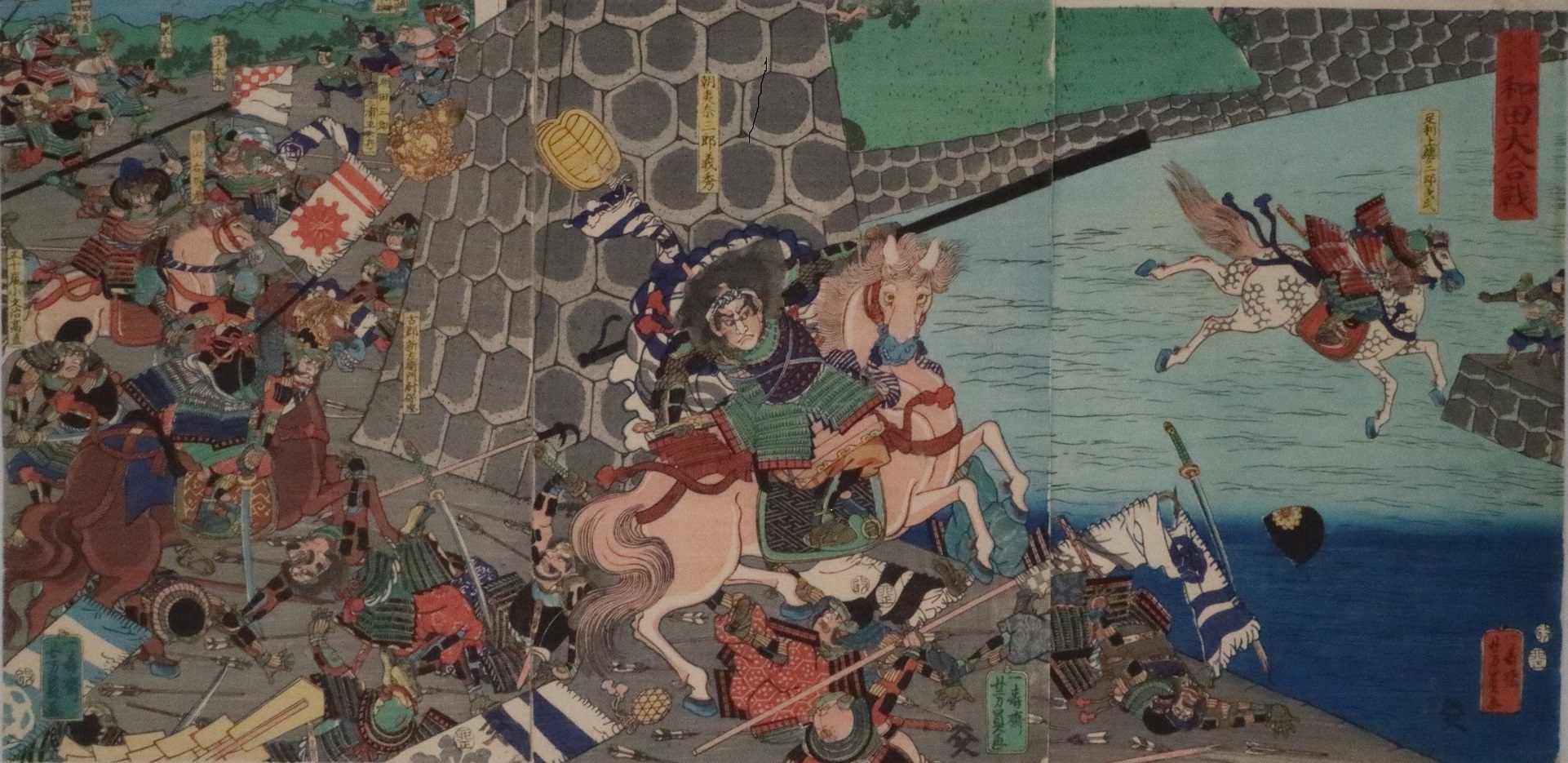 和田義盛(わだよしもり)一門(いちもん)九(きゅう)十(じゅう)三(さん)騎(き)大磯(おおいそ)におゐて三日(みっか)三(み)夜宴(やうたげ)を催(もよお)す折(おり)から小林(こばやし)朝比奈義秀(あさひなよしひで)曽我(そがの)五郎(ごろう)時宗(ときむね)が血気(けっき)にはやるを止(とめ)て互(たがい)に力量(りきりょう)をあらはす図(ず)
