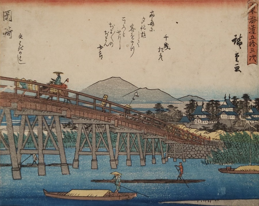 狂歌(きょうか):ふみ込(こめ)は 草(くた)臥(びれた)足(あし)も 直(なお)るかや 三里(さんり)たけなる 由井(ゆい)川(がわ)の水(みず)(結城亭雛機) 由井(ゆい)宿(しゅく)の西(にし)を流(なが)れる由(ゆ)井川(いがわ)(由比川(ゆいがわ))の景色(けしき)を描(えが)いています。由(ゆ)井川(いがわ)では夏(なつ)は徒歩(かち)渡(わた)しで渡(わた)り、冬(ふゆ)は仮(かり)橋(はし)が架(か)けられました。画(が)中(ちゅう)でも、冬(ふゆ)の浅(あさ)い川(かわ)に仮(かり)橋(はし)が架(か)けられ、荷物(にもつ)を担(かつ)いだ人足(にんそく)が急(いそ)いで渡(わた)る様子(ようす)が描(えが)かれています。左(ひだり)奥(おく)に蛇行(だこう)しながら続(つづ)く川面(かわも)が、画面(がめん)に奥行(おくゆ)きを与(あた)えています。