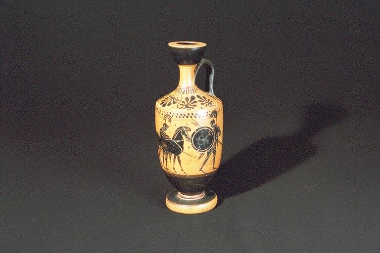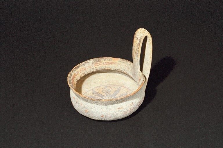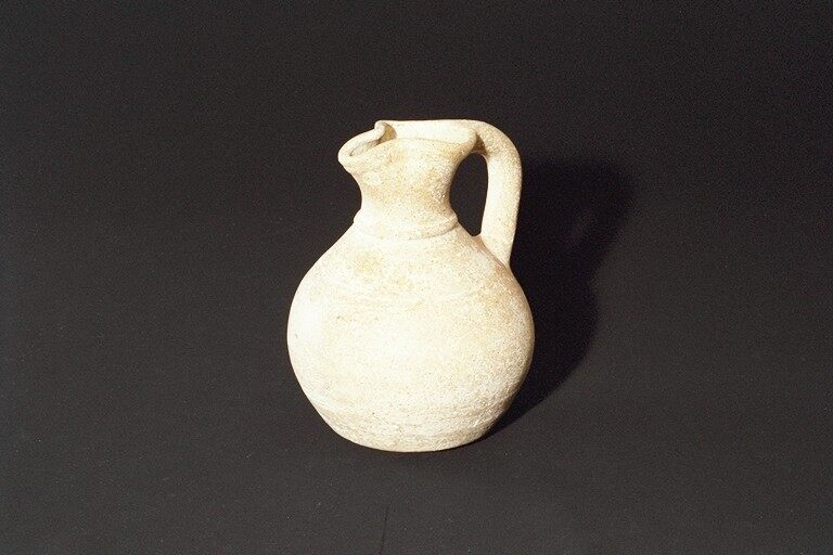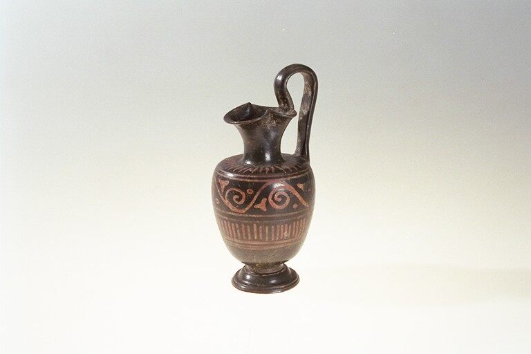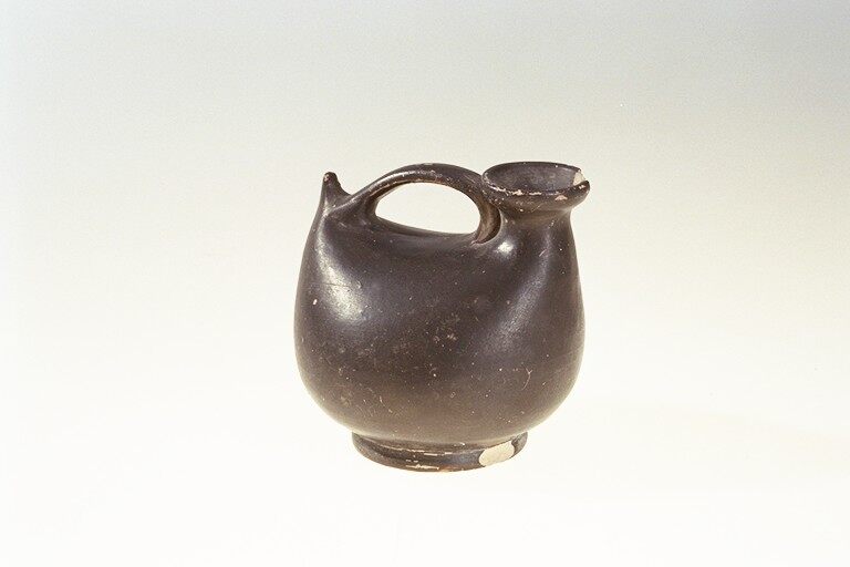 解説(かいせつ) ギリシア陶器(とうき)には数多(かずおお)くの器形(うつわがた)があり、いろいろな呼称(こしょう)がつけられています。器形(うつわがた)による用途(ようと)の違(ちが)いは、特殊(とくしゅ)なものを除(のぞ)いて厳密(げんみつ)ではなかったようですが、オイノコエは液体(えきたい)を汲(く)み、注(そそ)ぐための容器(ようき)と思(おも)われます。