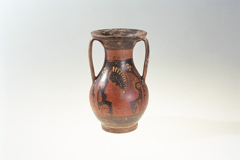 解説(かいせつ) ギリシア陶器(とうき)には数多(かずおお)くの器形(うつわがた)があり、いろいろな呼称(こしょう)がつけられています。器形(うつわがた)による用途(ようと)の違(ちが)いは、特殊(とくしゅ)なものを除(のぞ)いて厳密(げんみつ)ではなかったようですが、ペリケは貯蔵(ちょぞう)、運搬(うんぱん)用(よう)の容器(ようき)と思(おも)われます。