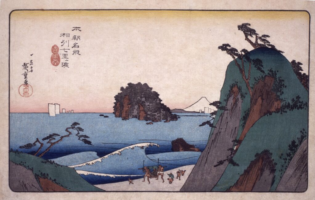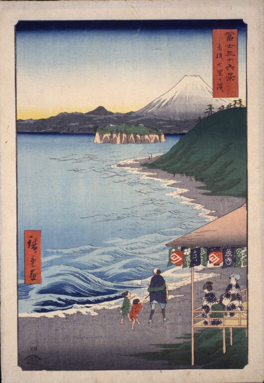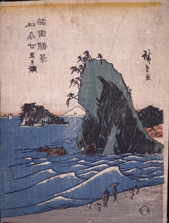 制作(せいさく)時期(じき):嘉永(かえい)5年(ねん)(1852)4月(しがつ)。 板元(はんもと):村市(むらいち) 安政(あんせい)6年(ねん)(1859年(ねん))に二代(にだい)歌川広重(うたがわひろしげ)を継(つ)いだ重宣(しげのぶ)は、重宣(しげのぶ)を名乗(なの)っている初期(しょき)の時代(じだい)(弘化(こうか)~安政(あんせい)5年(ねん))は初代(しょだい)の画風(がふう)を習(なら)い、風景画(ふうけいが)の模倣(もほう)や美人画(びじんが)・花鳥画(かちょうが)を描(えが)いています。この作品(さくひん)は「相州(そうしゅう)江(え)のしま詣(もうで)の図(ず)、七里(しちり)が浜(はま)真景(しんけい)」の構図(こうず)を人物(じんぶつ)の向(む)きや動(うご)きを少(すこ)し変(か)えて模倣(もほう)したもので、現状(げんじょう)は大判(おおばん)縦(たて)1枚(いちまい)ですが、最初(さいしょ)は師(し)と同(おな)じ大判(おおばん)縦(たて)3枚(さんまい)続(つづき)の構成(こうせい)で、中央(ちゅうおう)の1枚(まい)が残(のこ)ったと考(かんが)えられるものです。 そして更(さら)にこの図(ず)は彼自身(かれじしん)の作(さく)である「相州(そうしゅう)七里ヶ浜(しちりがはま)」大判(おおばん)3枚(まい)続(ぞく)、万延(まんえん)元年(がんねん)(1860年(ねん))刊(かん)板元(はんもと)萬屋(よろずや)の、中央(ちゅうおう)の1枚(まい)に座(すわ)って貝(かい)ひろいをしている女性(じょせい)の向(む)きを変(か)えただけで流用(りゅうよう)していることからも、七里ガ浜(しちりがはま)を描(えが)いた同(おな)じ図柄(ずがら)の3枚(まい)続(つづ)きであったことが知(し)られます。