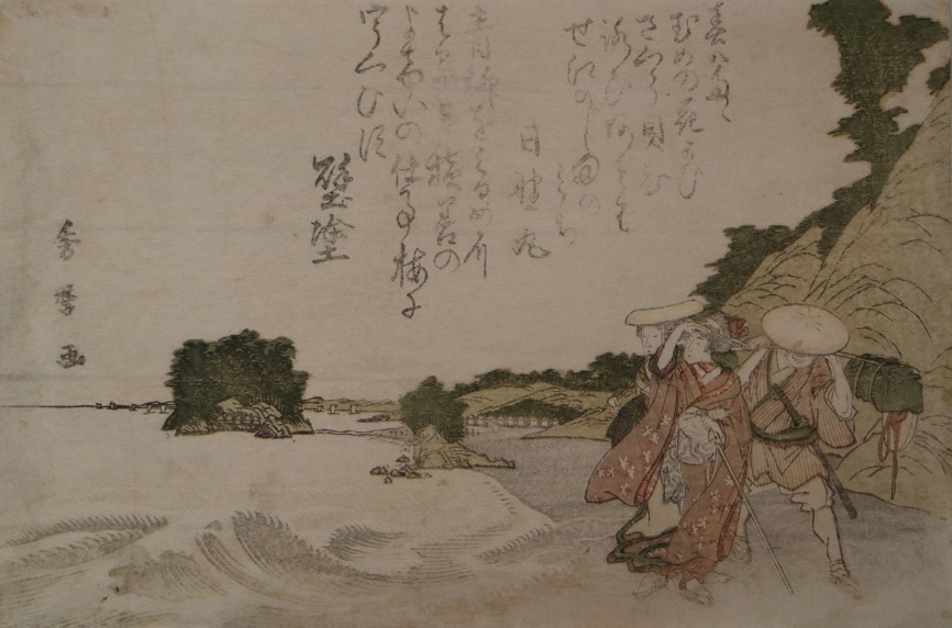 江(え)の島(しま)を背景(はいけい)に、女性(じょせい)二人(ふたり)が荷(に)担(かつ)ぎと共(とも)に浜辺(はまべ)を鎌倉(かまくら)方面(ほうめん)へ向(む)かって歩(ある)く様子(ようす)が描(えが)かれています。これは上部(じょうぶ)に狂歌(きょうか)の書(か)かれた摺物(すりもの)(私家(しか)版(ばん)として作(つく)られた配(くば)り物(もの))の作品(さくひん)であり、波(なみ)際(ぎわ)など摺(す)りや色合(いろあ)いが繊細(せんさい)な表現(ひょうげん)となっているところが特徴(とくちょう)です。 作者(さくしゃ)の秀麿(ひでまろ)は初代(しょだい)歌麿(うたまろ)の弟子(でし)で、美人画(びじんが)を多(おお)く残(のこ)しました。