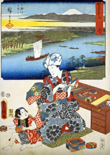 女性(じょせい)や子供(こども)が持(も)っている箱(はこ)は大森(おおもり)の名産(めいさん)である麦(むぎ)わら細工(ざいく)です。大森(おおもり)とは品川宿(しながわしゅく)と川崎宿(かわさきしゅく)の間(あいだ)にあった間(あい)の宿(しゅく)でした。この麦(むぎ)わら細工(ざいく)は川崎大師(かわさきだいし)でも名産(めいさん)品(ひん)として売(う)られています。 名所(めいしょ)として描(えが)かれているのは六郷(ろくごう)の渡(わた)しです。慶長(けいちょう)5年(ねん)(1600)に橋(はし)が架(か)けられてから、何度(なんど)も修復(しゅうふく)とかけ直(なお)しを繰(く)り返(かえ)し、貞享(じょうきょう)5年(ねん)(1688)に流(なが)されてからは明治時代(めいじじだい)になるまでこちらの図(ず)のように舟(ふね)渡(わた)しとなっていました。