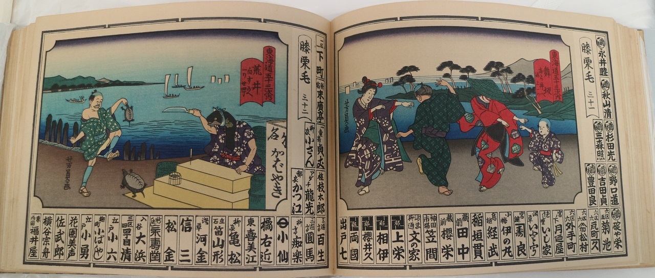 納札(のうさつ)文化(ぶんか)研究会(けんきゅうかい)が昭和(しょうわ)34年(ねん)度(ど)の会合(かいごう)のまとめとして発行(はっこう)した納札(のうさつ)(巡礼(じゅんれい)者(しゃ)が霊場(れいじょう)に参拝(さんぱい)したしるし)集(しゅう)兼(けん)浮世絵(うきよえ)集(しゅう)。 浮世絵(うきよえ)は歌川芳員(うたがわよしかず)の「東海道(とうかいどう)五十三次(ごじゅうさんつぎ)」(おもしろ東海道(とうかいどう)五十三次(ごじゅうさんつぎ))を、版(はん)を新(あら)たにして編集(へんしゅう)しています。隔月(かくげつ)の会合(かいごう)の内(うち)には、2回(かい)にわたって「東海道五十三次(とうかいどうごじゅうさんつぎ)膝栗毛(ひざくりげ)」を扱(あつか)っている回(かい)があり、軽妙(けいみょう)な画風(がふう)が好(この)まれて復刻(ふっこく)されたものでしょうか。 保存会(ほぞんかい)には江戸(えど)演芸(えんげい)関係者(かんけいしゃ)も多(おお)くいたようで、納札(のうさつ)(を収(おさ)めたメンバー)には、江戸文字(えどもじ)(江戸時代(えどじだい)に盛(さか)んに使用(しよう)された図案(ずあん)文字(もじ)の総称(そうしょう)。それぞれの書体(しょたい)は別々(べつべつ)の名称(めいしょう)を持(も)ち、もともとは使用(しよう)される用途(ようと)も違(ちが)っていた)の橘(たちばな)右近(うこん)、寄席(よせ)の新宿末廣亭(しんじゅくすえひろてい)、講談(こうだん)の一(いち)竜(りゅう)斎(さい)貞丈(ていじょう)、落語(らくご)の三遊亭圓馬(さんゆうていえんば)、三遊亭百生(さんゆうていひゃくしょう)、柳家小(やなぎやこ)さん、奇術(きじゅつ)のアダチ龍光(りゅうこう)、柳亭痴楽(りゅうていちらく)、漫才(まんざい)の都家(みやこや)かつ江(え)、桂枝太郎(かつらえだたろう)などの名前(なまえ)が見(み)られます。