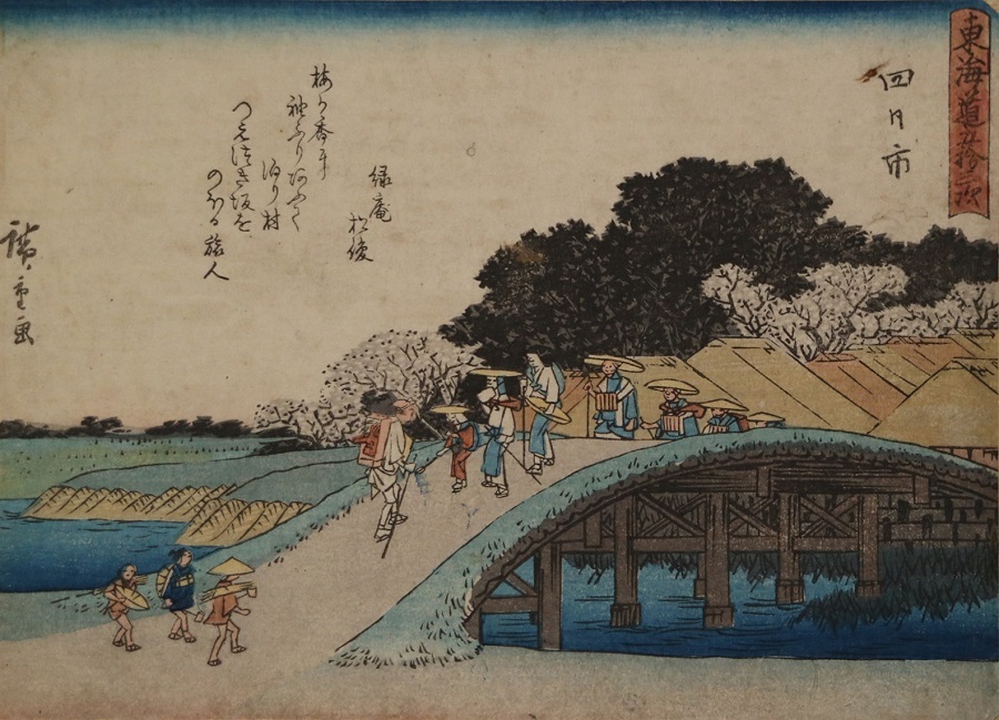 狂歌(きょうか):梅(うめ)か香(か)に 袖(そで)ふりあふて 泊(とま)り村(むら) つえつき坂(ざか)を のぼる旅人(たびびと)(緑庵松俊) 四日市宿(よっかいちしゅく)の先(さき)に架(か)かる橋(はし)を、巡礼(じゅんれい)者(しゃ)、天狗(てんぐ)の面(めん)を背負(せお)った金毘羅(こんぴら)参(まい)りの男性(だんせい)、伊勢(いせ)参(まい)り(抜(ぬ)け参(まい)り)の子供(こども)たちなどが行(い)き交(か)う様子(ようす)を描(えが)いています。四日市宿(よっかいちしゅく)には、東海道(とうかいどう)と伊勢街道(いせかいどう)の分岐(ぶんき)である日永(ひなが)の追分(おいわけ)があったので、多(おお)くの旅人(たびびと)でにぎわっていたそうです。