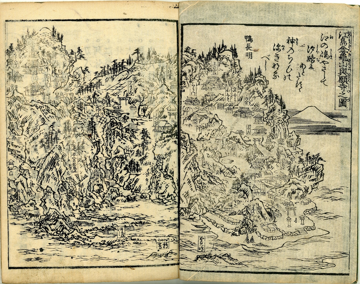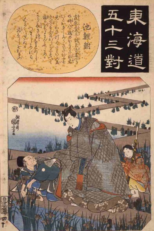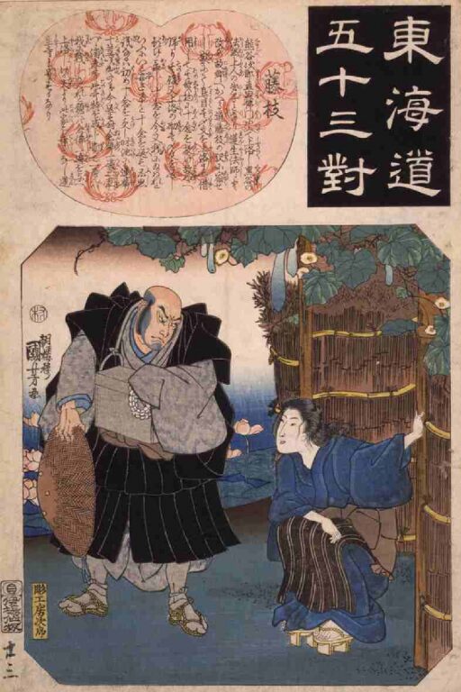 宮宿以降、京都まで国貞オリジナルの背景に変化しますが、四日市宿の背景は例外的に広重の保永堂版東海道「四日市 三重川」からの引用になります。