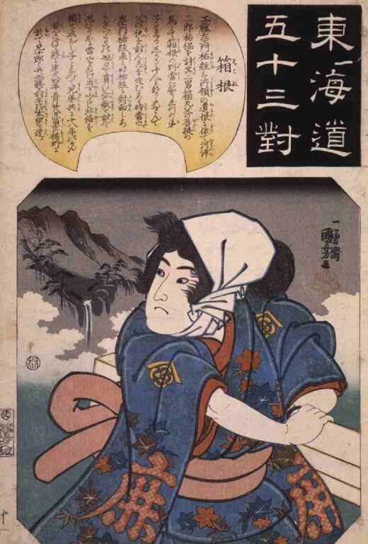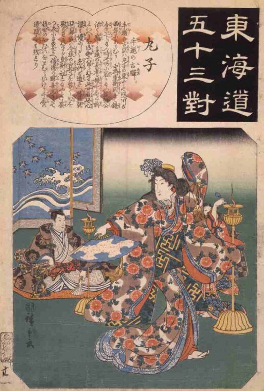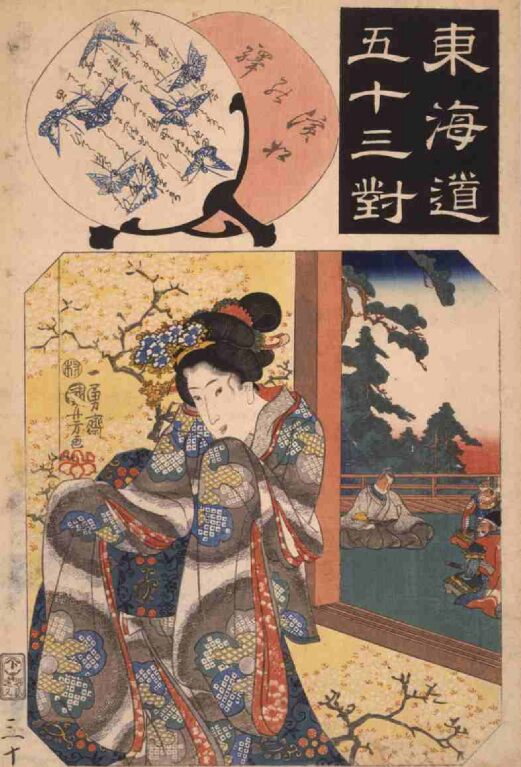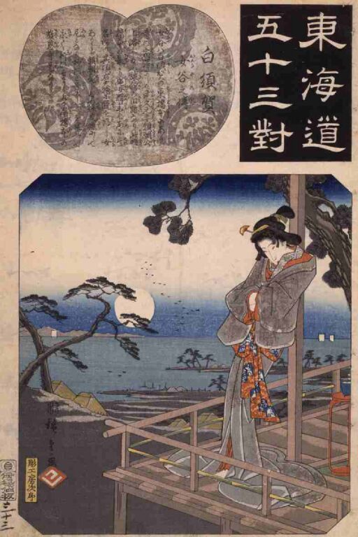 国貞(三代豊国の前名)描くこの東海道シリーズは、各宿の風景をバックにして前面に立ち姿の美人を描いたもので、全シリーズを通し、バックの風景画は広重の保永堂版東海道に非常によく似ています。