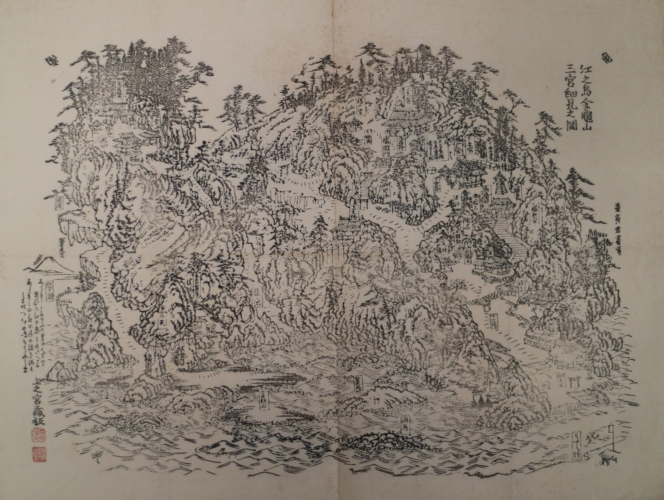 本図は江の島の島内全体を詳細に描いた絵図です。江の島の北側から描いていますが、本来なら画中に見えない位置にある南側の岩屋なども描かれ、江の島全体が画中に全ておさまっています。 金亀山とは江の島の別名です。本宮の別当であった岩本院は慶安2年(1649)に京都の真言宗御室派仁和寺の直末寺となり「金亀山與願寺」の寺号を称しました。江の島は初期の浮世絵では霊亀の背中に存在するともいわれる蓬莱山のイメージを仮託されていることが多く、また実際の島の形が亀に似ているともいわれているため、江の島は亀のイメージが定着していたようです。 |
