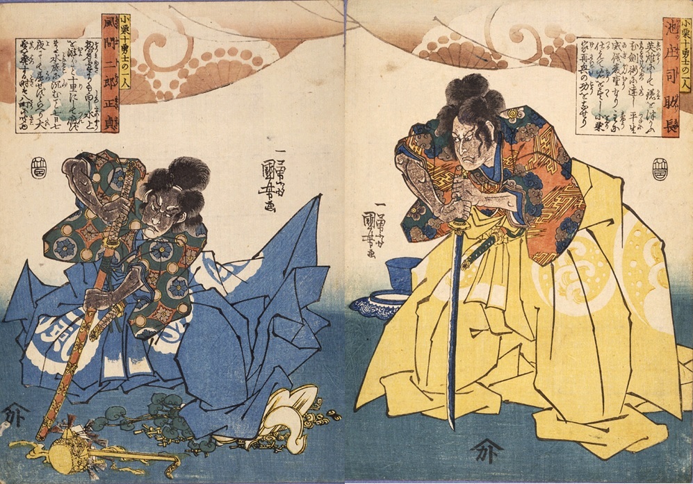 武者絵を得意とした国芳により描かれた本作は「小栗十勇士(おぐりじゅうゆうし)」という、小栗判官の優れた家臣を描いたシリーズです。説教節では「小栗と共に毒殺された家臣が十人いた」という内容が伝えられています。現在でも、戦国武将・真田幸村(さなだゆきむら)の家臣「真田十勇士(さなだじゅうゆうし)」の物語がよく知られていますが、同じように江戸時代に好まれた家臣団の活躍物語が主題になっています。鬼鹿毛の水桶から水を飲む姿や、甲冑を使って粥のようなものを作る姿など、戦場における様々な描写が見られる点が面白い作品です。 |