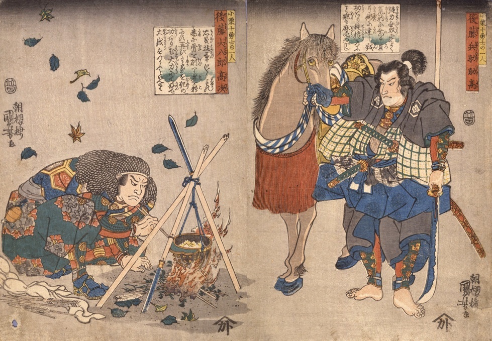 武者絵を得意とした国芳により描かれた本作は「小栗十勇士」という、小栗判官の優れた家臣を描いたシリーズです。説教節では「小栗と共に毒殺された家臣が十人いた」という内容が伝えられています。現在でも、戦国武将・真田幸村の家臣「真田十勇士」の物語がよく知られていますが、同じように江戸時代に好まれた家臣団の活躍物語が主題になっています。鬼鹿毛の水桶から水を飲む姿や、甲冑を使って粥のようなものを作る姿など、戦場における様々な描写が見られる点が面白い作品です。 |