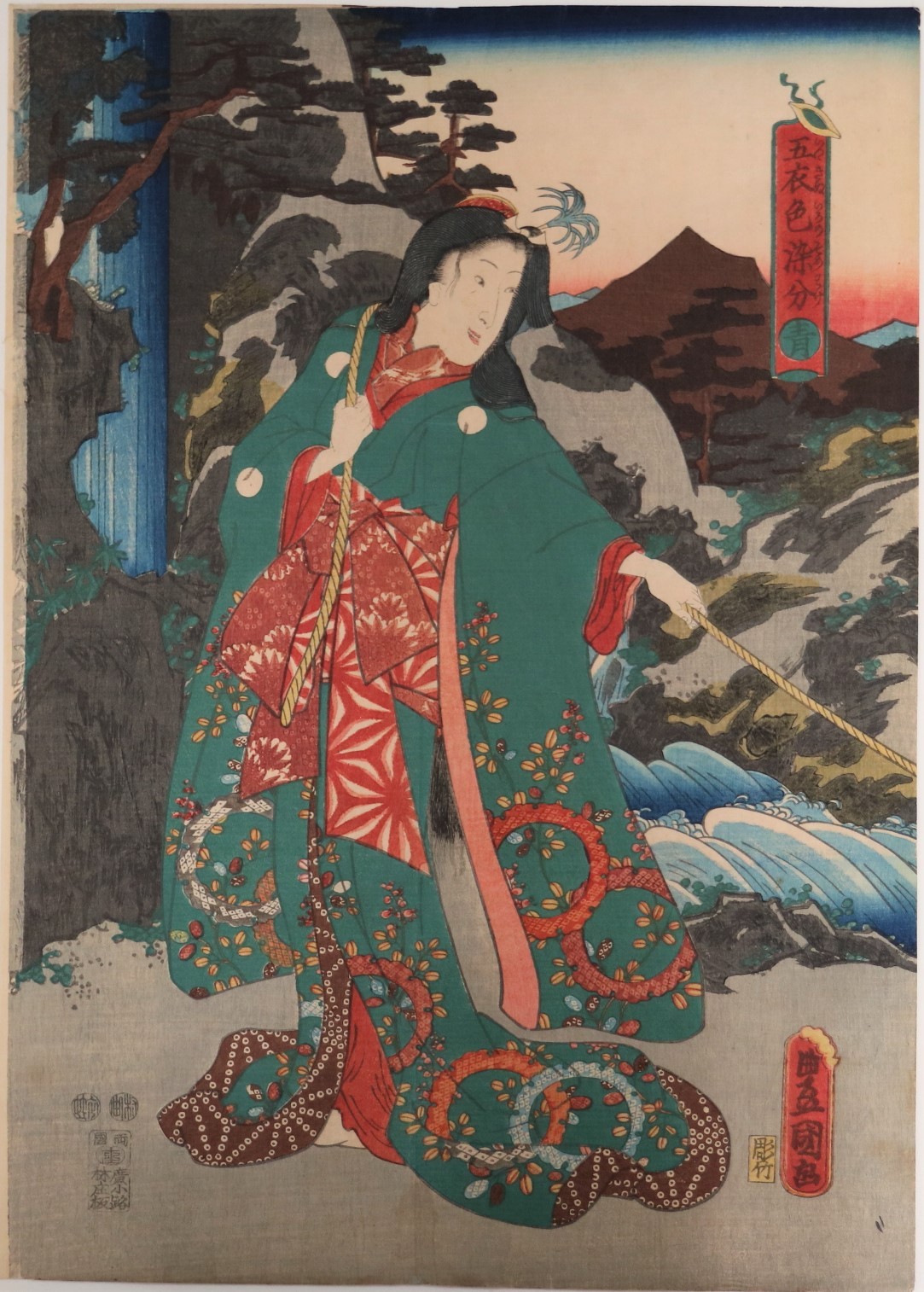 五行説において重要な色とされていた「黄」「青」「赤」「白」「黒」の5色に、それぞれ美人が当てはめて描かれています。またこの美人たちは、歌舞伎の登場人物に擬えて描かれており、各色は、その役が決まって着る衣装の色と対応しています。 「青」に描かれているのは、小栗判官ものの物語に登場する照手姫。小栗判官は藤沢の遊行寺とゆかりのある人物で、照手姫は小栗判官の恋人です。 青:照手姫(小栗判官の物語より) 小栗判官は一度毒殺され、蘇生したものの餓鬼のような姿になってしまいました。この作品では、餓鬼状態の小栗判官を、照手姫が熊野の温泉まで荷車に乗せて引いていくという場面が描かれています。 照手姫は物語中、「常陸小萩」と名乗り遊女屋で下働きをしたという話があることから、着物の柄として萩が配されています。なお、摺られた着物の色を見ると緑に見えますが、江戸時代はこの色も「青」に含めました。 |